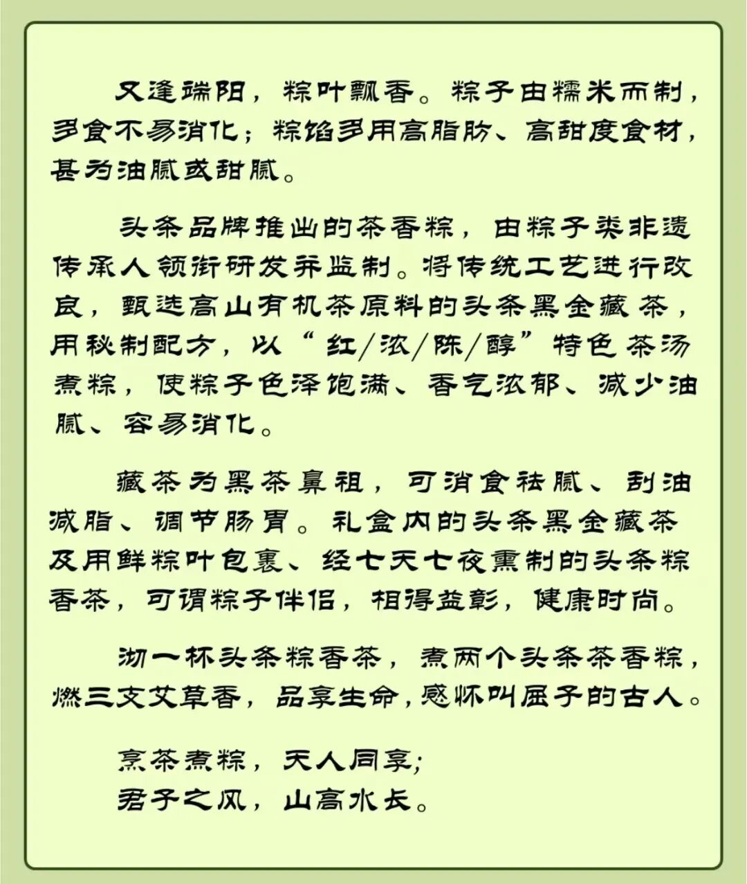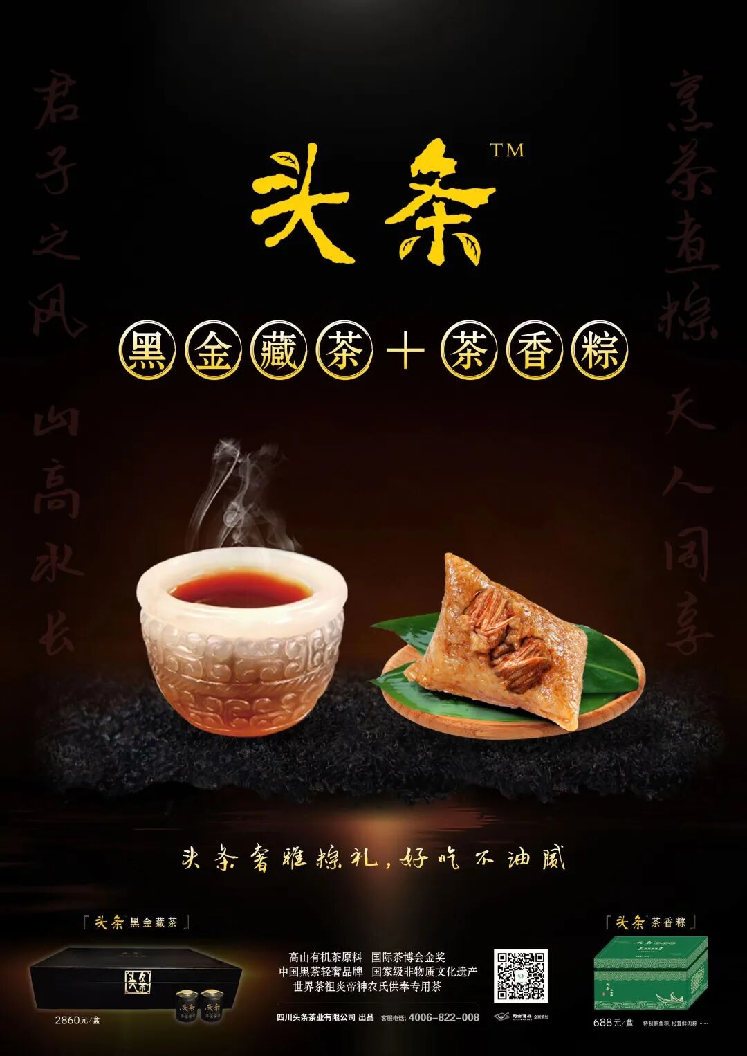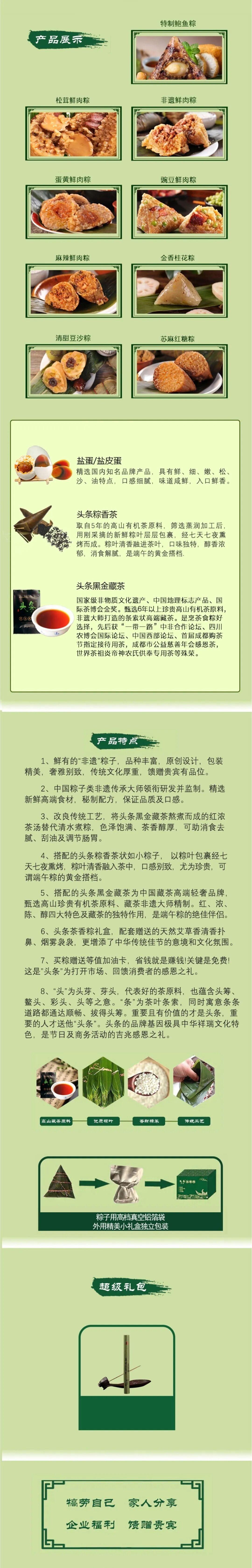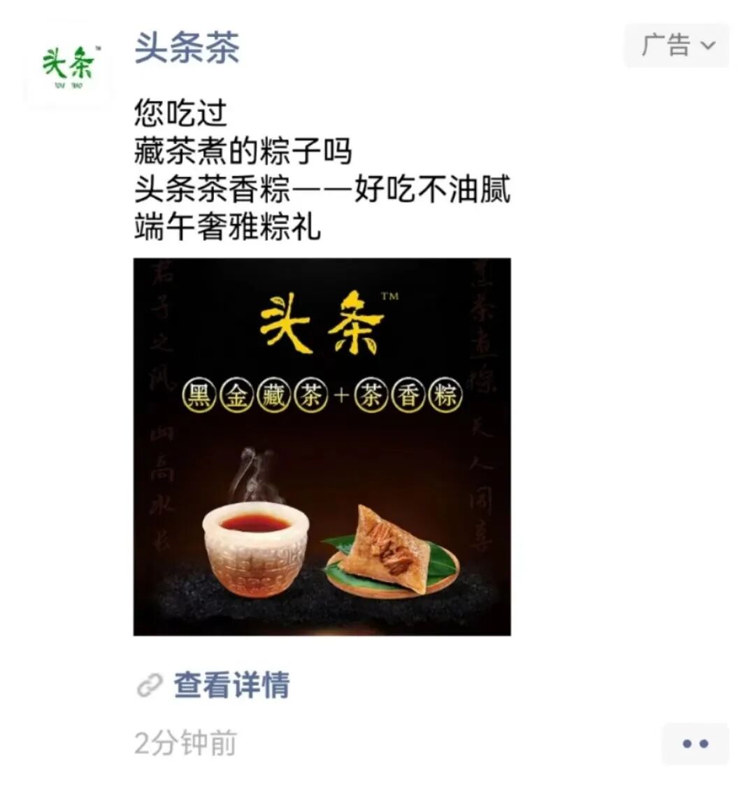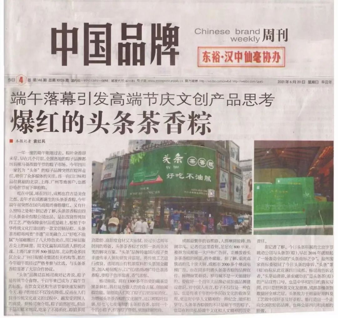 所以命名茶香粽,其一是头条坚守立足茶产业链的专注原则。其二是粽子不易消化,粽馅太油腻。“头条”品牌特邀国内粽子类非遗传承人领衔研发并监制,将传统工艺进行改良,选用高山有机茶原料的头条黑金藏茶,加入秘制配方,以“红/浓/陈/醇”特色茶汤煮粽,使粽子色泽饱满、香气浓郁。藏茶为黑茶鼻祖,具有强大消食去腻、刮油减脂功能。为增强头条茶香粽文化特点,还以鲜粽叶包裹、经七天七夜熏制的粽子形状的头条粽香茶,作为粽子伴侣,更加健康时尚。
